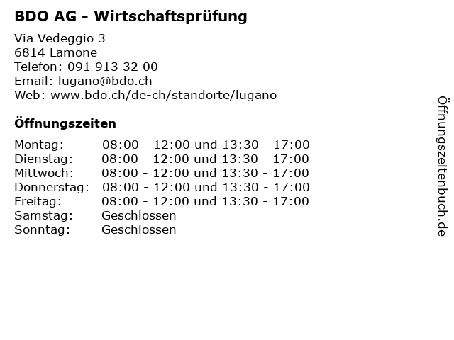 | Öffnungszeiten BDO AG - Wirtschaftsprüfung in Lamone anzeigen | |