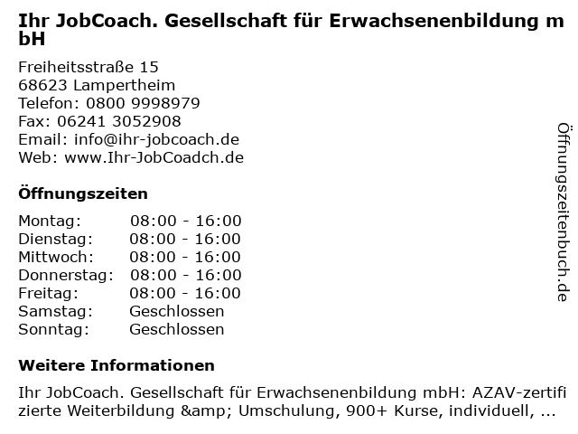 1 Ihr JobCoach. Gesellschaft für Erwachsenenbildung mbH (Entfernung: 3,34 km) Industriestraße 11, 68642 Bürstadt 2 Ihr JobCoach. Gesellschaft für Erwachsenenbildung mbH (Entfernung: 14,45 km) Harzstraße 1, 64646 Heppenheim 6 |