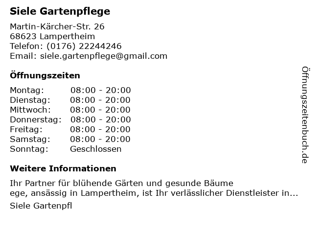 | Öffnungszeiten Siele Gartenpflege in Lampertheim anzeigen | |