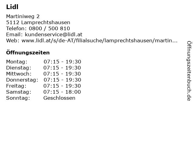 | Öffnungszeiten Lidl in Lamprechtshausen anzeigen | |