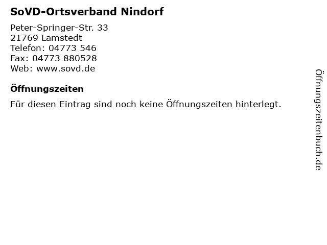 | Öffnungszeiten SoVD-Ortsverband Nindorf in Lamstedt anzeigen | |