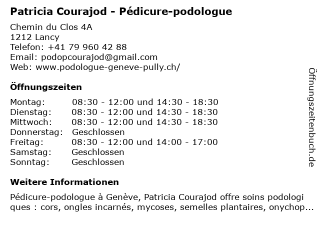 2 Dr méd. Anne-Patricia Brunelli Roche - Gynécologie et obstétrique (Entfernung: 3,22 km) Avenue de Champel 24, 1206 Genève 5 Arnoult Aurelie , Podologue et Pédicure médicale (Entfernung: 3,87 km) Rue du Vieux-Collège 4, 1204 Genève 6 |