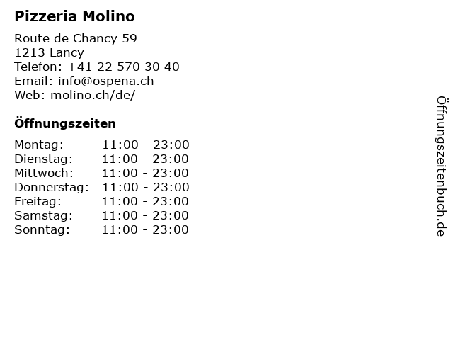 | Öffnungszeiten Pizzeria Molino in Lancy anzeigen | |