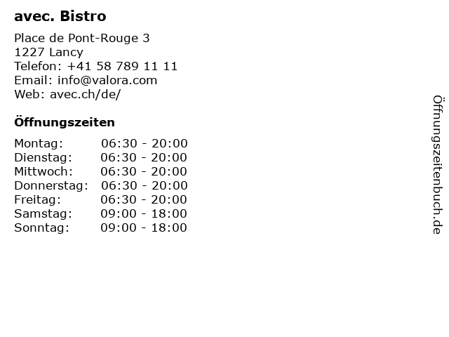 | Öffnungszeiten avec. Bistro in Lancy anzeigen | |