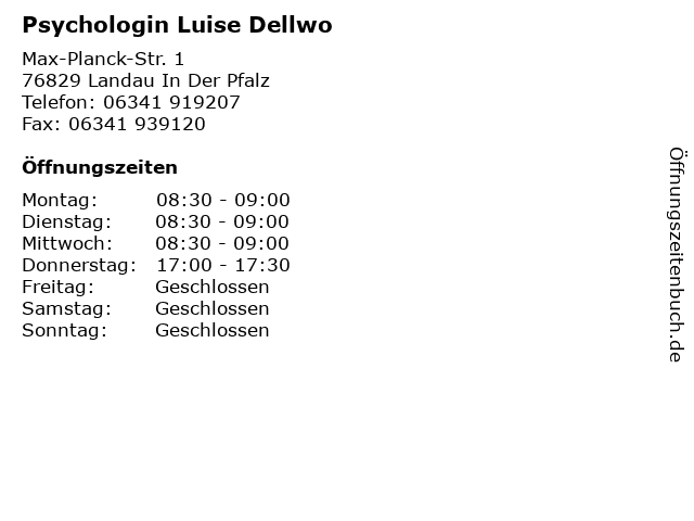 1 Dipl.-Psychologin Susanne Doppler Kinder- und Jugendlichenpsychotherapeutin (Entfernung: 0,31 km) Alfred-Nobel-Platz 1, 76829 Landau 2 5 Dr. med. Monika-Luise Bär-Degitz Fachärztin für Psychiatrie und Psychotherapie (Entfernung: 9,78 km) Heidenschuhstr. 2, 76889 Klingenmünster 6 |