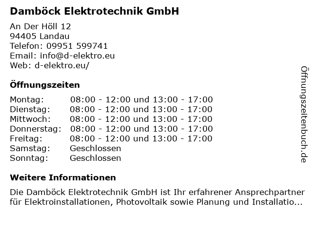 | Öffnungszeiten Damböck Elektrotechnik GmbH in Landau anzeigen | |