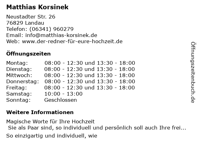 | Öffnungszeiten Matthias Korsinek in Landau anzeigen | |