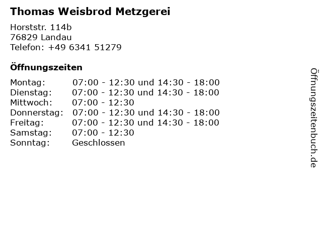 | Öffnungszeiten Thomas Weisbrod Metzgerei in Landau anzeigen | |