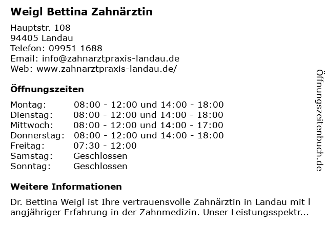 | Telefonnummer Weigl Bettina Zahnärztin in Landau (09951 1688) anrufen | |