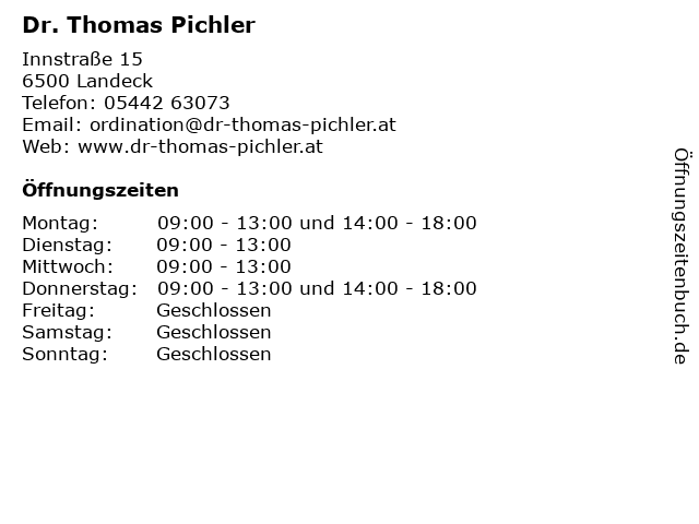 | Öffnungszeiten Dr. Thomas Pichler in Landeck anzeigen | |