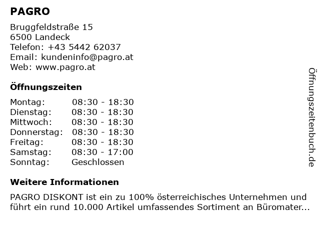 | Öffnungszeiten PAGRO in Landeck anzeigen | |