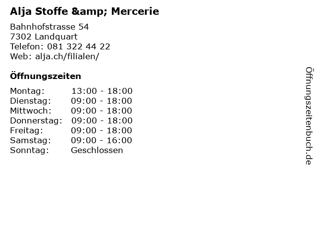 | Öffnungszeiten Alja Stoffe & Mercerie in Landquart anzeigen | |