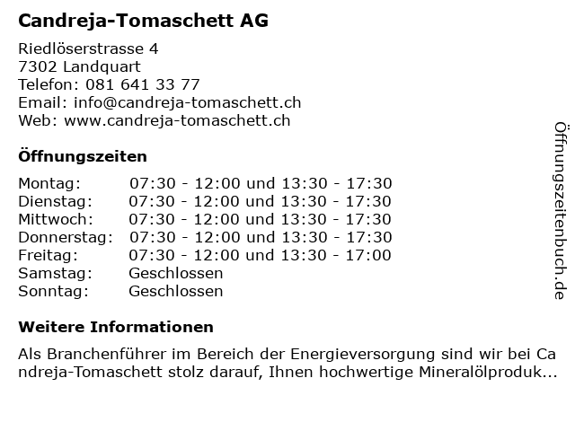 | Öffnungszeiten Candreja-Tomaschett AG in Landquart anzeigen | |