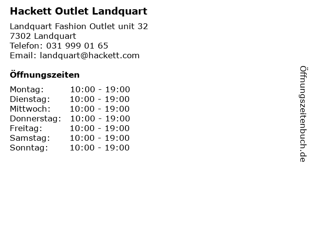 | Öffnungszeiten Hackett Outlet Landquart in Landquart anzeigen | |