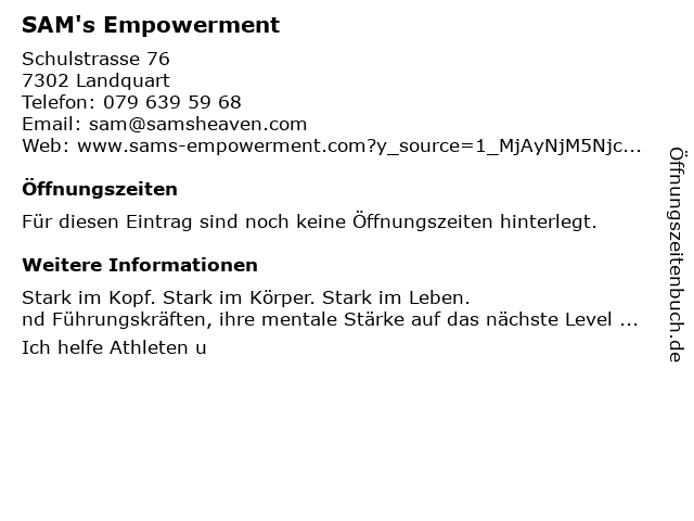 | Öffnungszeiten SAM's Empowerment in Landquart anzeigen | |