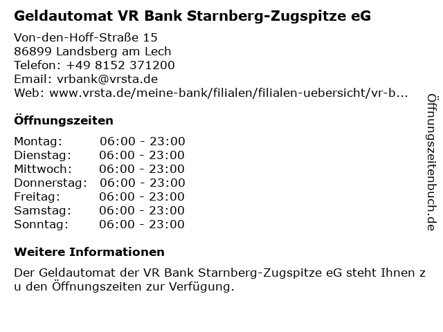 1 Geldautomat VR Bank Starnberg-Zugspitze eG (Entfernung: 6,67 km) Landsberger Straße 18, 86932 Lengenfeld 4 VR Bank Starnberg-Herrsching-Landsberg eG - (SB-Filiale Landsberg West) (Entfernung: 0,04 km) Von-den-Hoff-Platz 15, 86899 Landsberg 5 VR-Bank Landsberg-Ammersee eG - (Geldautomat Geschäftsstelle) (Entfernung: 1,20 km) Ludwigstrasse 162-164, 86899 Landsberg 6 VR-Bank Landsberg-Ammersee eG (Geldautomat McDonalds) (Entfernung: 1,94 km) Augsburger Strasse 66, 86899 Landsberg |