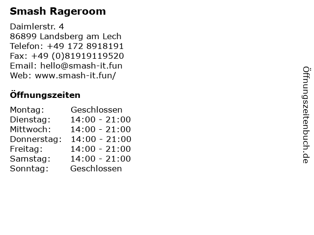 | Öffnungszeiten Smash Rageroom in Landsberg am Lech anzeigen | |
