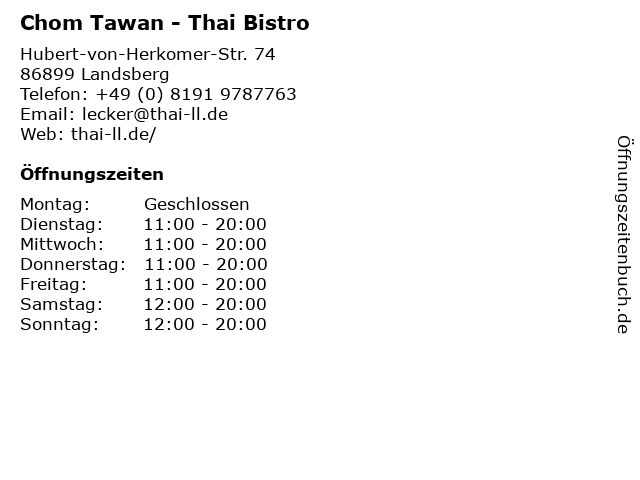 | Öffnungszeiten Chom Tawan - Thai Bistro in Landsberg anzeigen | |