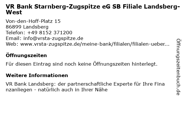 | VR Bank Starnberg-Zugspitze eG SB Filiale Landsberg-West anrufen | |