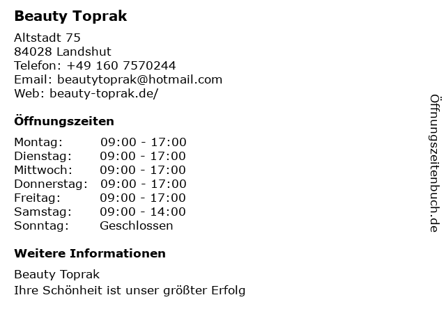 | Öffnungszeiten Beauty Toprak in Landshut anzeigen | |