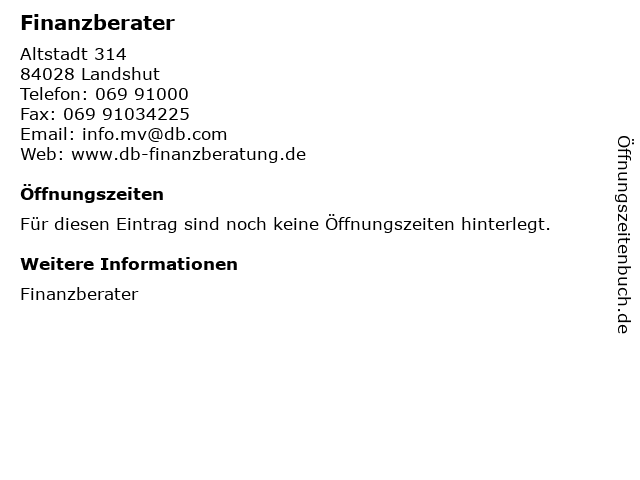 | Öffnungszeiten Finanzberater in Landshut anzeigen | |