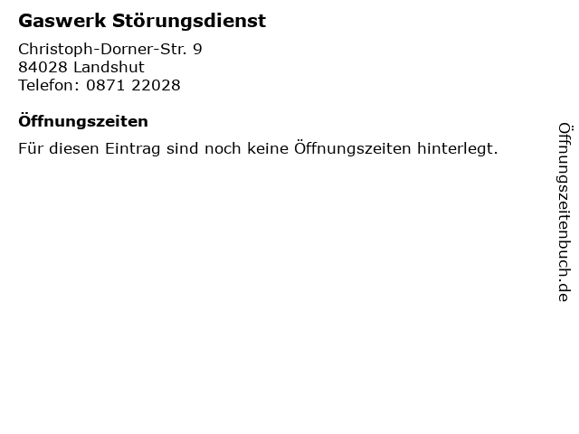| Öffnungszeiten Gaswerk Störungsdienst in Landshut anzeigen | |