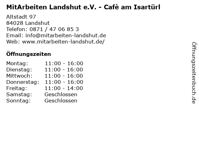 Branchen & Suchbegriffe zu MitArbeiten Landshut e.V. - Cafè am Isartürl:cafe, cafè, catering, e.v., isartürl, mitarbeiten, mittagessen, regional, treff, verein |