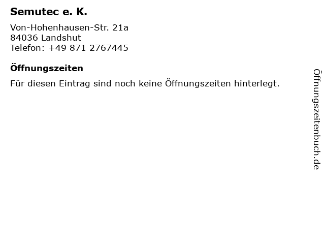 | Öffnungszeiten Semutec e. K. in Landshut anzeigen | |