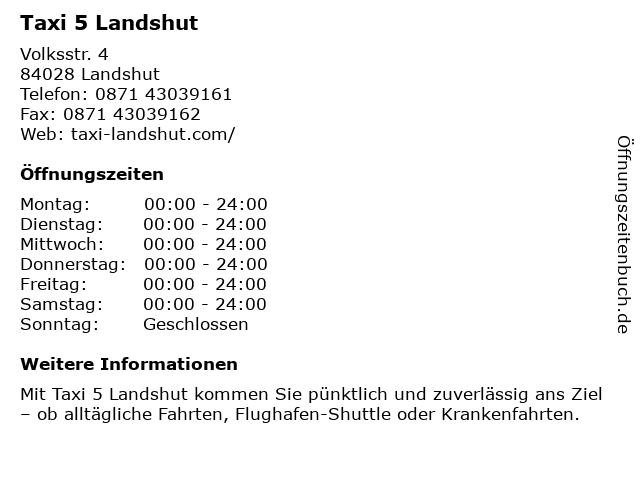 | Öffnungszeiten Taxi 5 Landshut in Landshut anzeigen | |