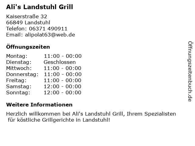 | Öffnungszeiten Ali's Landstuhl Grill in Landstuhl anzeigen | |