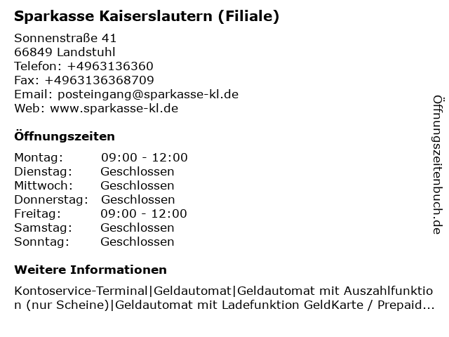 3 Sparkasse Kaiserslautern (SB-Filiale) (Entfernung: 6,75 km) Ramsteiner Straße 14a, 66877 Ramstein-Miesenbach 6 |