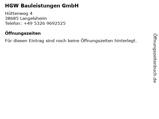 | Öffnungszeiten HGW Bauleistungen GmbH in Langelsheim anzeigen | |