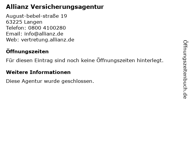 | Öffnungszeiten Allianz Versicherungsagentur in Langen anzeigen | |