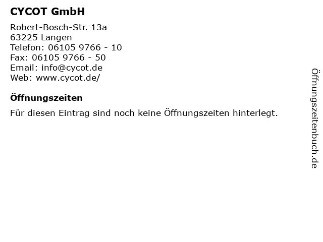 | Öffnungszeiten CYCOT GmbH in Langen anzeigen | |