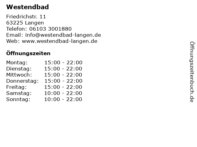| Öffnungszeiten Westendbad in Langen anzeigen | |