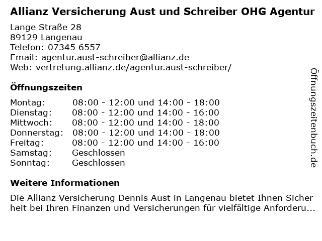 1 Allianz Versicherung Aust und Schreiber OHG Agentur (Entfernung: 13,95 km) Lange Straße 42, 89542 Herbrechtingen 4 SCHREIBER-BAUTEC - Günzburg Bauingenieurwesen (Entfernung: 12,25 km) Von-Greyerz-Str. 2, 89312 Günzburg 5 Werkstattladen Merz & Schreiber Marion Merz u. Marlies Schreiber (Entfernung: 13,41 km) Jörg-Syrlin-Str. 31, 89081 Ulm 6 |