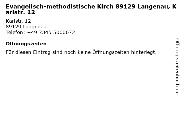 | Evangelisch-methodistische Kirch 89129 Langenau, Karlstr. 12 anrufen | |