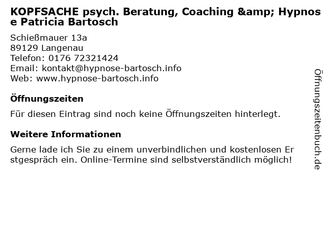 | KOPFSACHE psych. Beratung, Coaching & Hypnose Patricia Bartosch anrufen | |