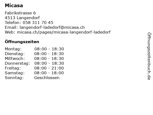 | Öffnungszeiten Micasa in Langendorf anzeigen | |