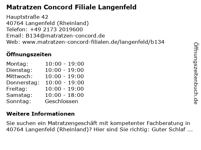 2 Matratzen Concord Filiale Leverkusen-Opladen (Entfernung: 5,90 km) Im Hederichsfeld 16, 51379 Leverkusen 6 |