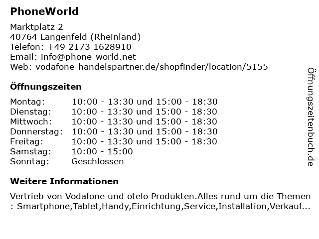 | Öffnungszeiten PhoneWorld in Langenfeld (Rheinland) anzeigen | |