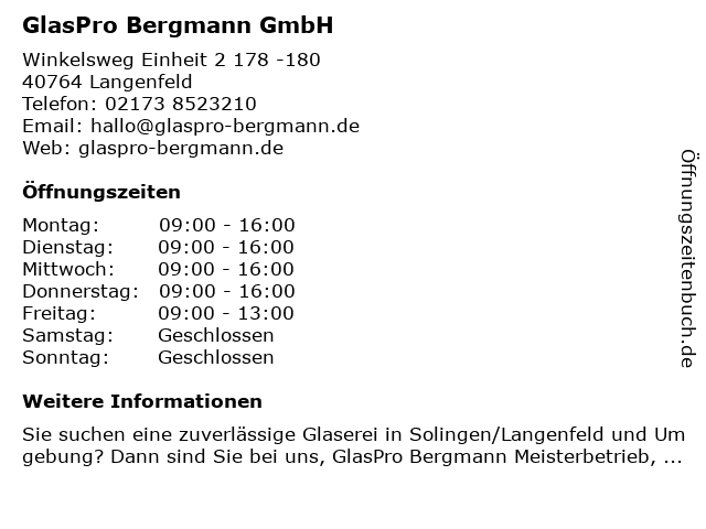 | Öffnungszeiten GlasPro Bergmann GmbH in Langenfeld anzeigen | |