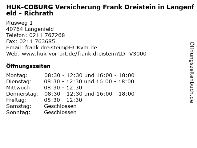 1 HUK Kundendienstbüro Frank Dreistein Versicherungsbüro (Entfernung: 0,01 km) Piusweg 1, 40764 Langenfeld 2 Sterbenothilfe (Sterbekasse) Richrath-Berghausen gegr. 1923 (Entfernung: 0,20 km) Marthastr. 3, 40764 Langenfeld 3 Hausarztpraxis Richrath Botzen & Piorr - Fachärzte für Allgemeinmedizin (Entfernung: 0,21 km) Marthastraße 39, 40764 Langenfeld 5 HUK-COBURG Versicherung Heiko Faßbender in Düsseldorf - Garath (Entfernung: 3,60 km) Reinhold-Schneider-Straße 92, 40595 Düsseldorf 6 HUK-COBURG Versicherung Wolfgang Cüppers in Erkrath - Hochdahl (Entfernung: 7,36 km) Immermannstr. 2, 40699 Erkrath |