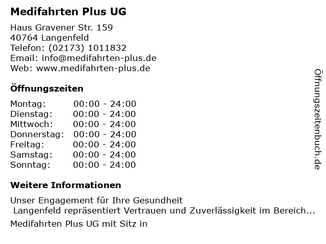 | Öffnungszeiten Medifahrten Plus UG in Langenfeld anzeigen | |