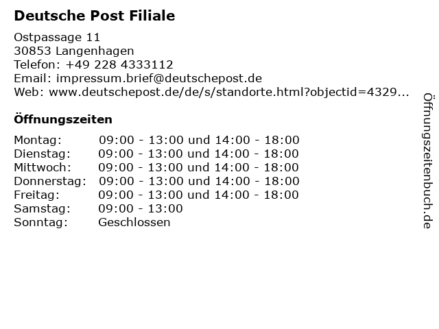 Öffnungszeiten Deutsche Post Filiale in Langenhagen anzeigen | |