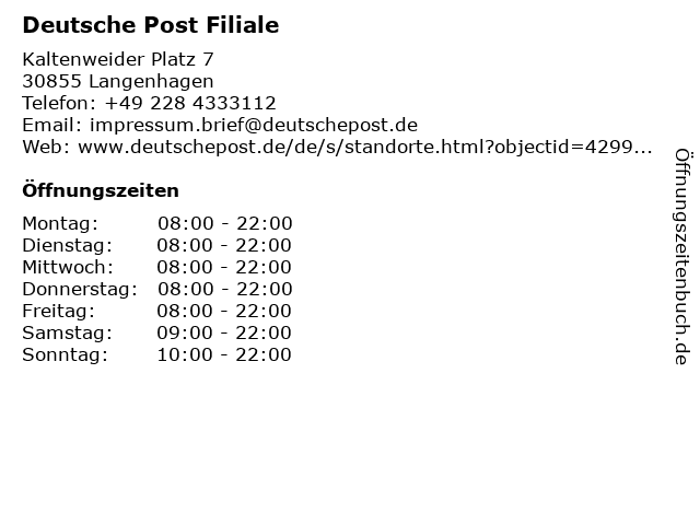Öffnungszeiten Deutsche Post Filiale in Langenhagen anzeigen | |