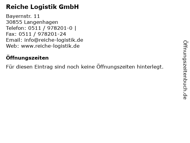 | Öffnungszeiten Reiche Logistik GmbH in Langenhagen anzeigen | |