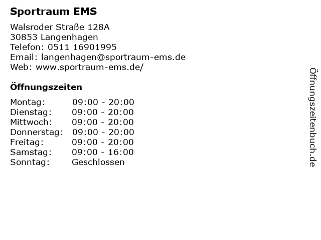 | Öffnungszeiten Sportraum EMS in Langenhagen anzeigen | |