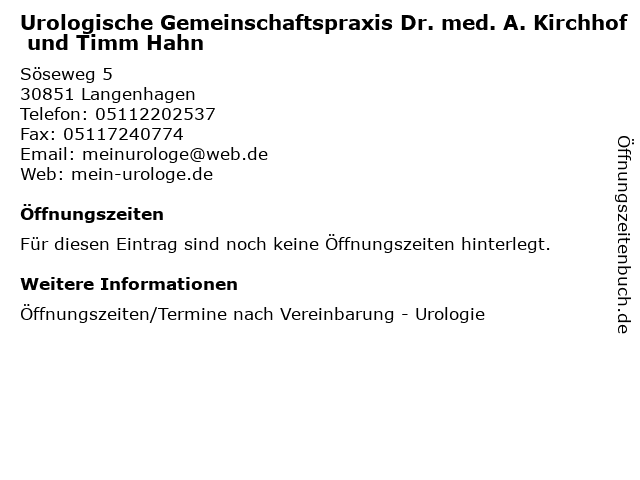 | Urologische Gemeinschaftspraxis Dr. med. A. Kirchhof und Timm Hahn anrufen | |