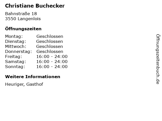 | Öffnungszeiten Christiane Buchecker in Langenlois anzeigen | |